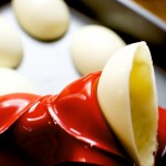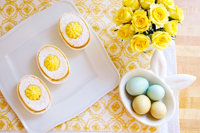For Easter, try this festive take on stuffed egg hors d’oeuvres. Instead of deviled eggs, these pastry cream & cake dessert eggs are angelic and sweet. Like… me! (Mwahahahaaaa!) I found a new product to play with, and this was the result!
